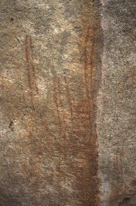 Brief description of art: The art consists of a large panel of images and many are well preserved. The images include: concentric circles, concentric circles with externally radiating lines, circles with externally radiating lines, concentric circles with externally attached half circles. There are also sets of long parallel vertical lines one set partially crossed by horizontal lines, various short vertical and horizontal sausage shapes with multiple internal divisions. A vertical meander, a long vertical line crossed by an upward curving horizontal line and 3 more complex geometric motifs. All the images were applied by finger in red.