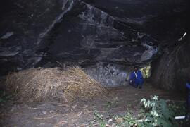 Brief description of art: The whole shelter quite blackened by soot. The images are on the back wall and on the ceiling, many are rather unclear and blackened. The images include: many spread-eagled designs, one remarkably large and fat, a snake-like meander all daubed in white. Also a set of concentric half-circles open at base applied by finger in white.