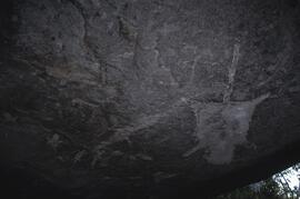 Brief description of art: The art consists of many varied spread-eagled designs all daubed in white, the one on the ceiling is remarkable in size and has been repainted at least twice. Some of the images are heavily blackened by soot. At the left end of the shelter and there are a few red designs applied by finger including dots, short vertical lines, a concentric circle and a half circle open at top with single internal vertical division.