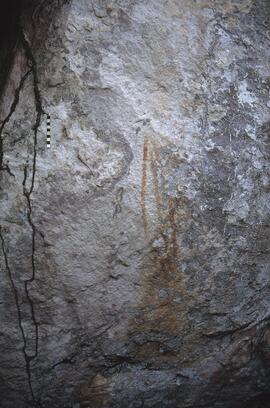 Brief description of art: The Pictograph is by entrance to cavity in which spirit is said to dwell. There is a single design: a vertically stretched circle with single internal division and 3 vertical lines radiating downwards from its base. Applied by finger in red.