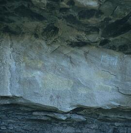 Brief description of site: This 'site' is, in fact, a series of rock-paintings located along 160 m of rocky krantz line. The general aspect is ENE to NE. There is dense vegetation and the floors of the shelters are mostly rock with pockets of flood-washed deposit. The bottom krantz stratum is a crumbly mudstone overlain with harder quatzitic sandstone. There are many areas where rock has collapsed, often forming shelters. 4 artificial driplines - installed by the Rudners in 1966/1967 are still visible in one of the shelters but their effectiveness is now zero.