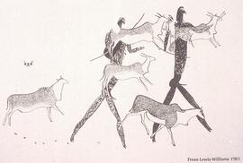 There are in excess of 300 individual San rock-paintings in the site. These paintings occur in two giant panels on two tiers. The size, quantity, quality and variety of the imagery shows that the site was not only used as a practical living shelter, but also a locus of great spiritual importance to the San. The paintings are too numerous to discuss individually and I highlight certain image clusters: