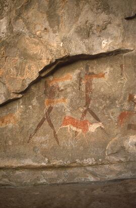 There are in excess of 300 individual San rock-paintings in the site. These paintings occur in two giant panels on two tiers. The size, quantity, quality and variety of the imagery shows that the site was not only used as a practical living shelter, but also a locus of great spiritual importance to the San. The paintings are too numerous to discuss individually and I highlight certain image clusters: