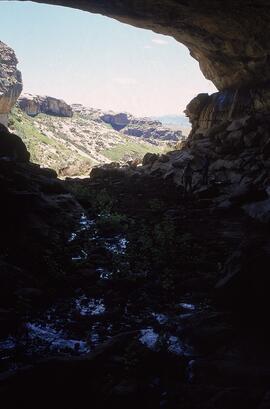 Brief description of site: Unlike most southern African rock-painting sites, this is not a 'shelter' but a cave, proper. 35 m wide, up to 10 m high and 39.72 m deep, The site has cathedral-like proportions. The cave also has two tiers with the lower tier being composed of a mostly level to slightly sloping sandy floor. The upper tier is composed of a rock ledge that runs along the cave's northern and southern walls. A natural spring burbles out from the back of the cave. RSA BUL1 faces East North East - North East and is situated in a tributary of the Kraai River, which is less than 1.2 km to the South East. Curiously, for such a huge cave, The site is secluded and is not visible until one is almost upon the cave. The sight also has excellent acoustics both within the cave and the echo down the valley.