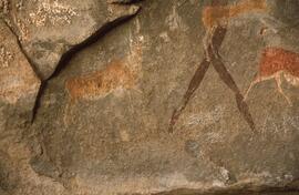 There are in excess of 300 individual San rock-paintings in the site. These paintings occur in two giant panels on two tiers. The size, quantity, quality and variety of the imagery shows that the site was not only used as a practical living shelter, but also a locus of great spiritual importance to the San. The paintings are too numerous to discuss individually and I highlight certain image clusters: