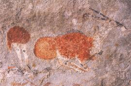 There are in excess of 300 individual San rock-paintings in the site. These paintings occur in two giant panels on two tiers. The size, quantity, quality and variety of the imagery shows that the site was not only used as a practical living shelter, but also a locus of great spiritual importance to the San. The paintings are too numerous to discuss individually and I highlight certain image clusters: