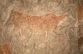 There are in excess of 300 individual San rock-paintings in the site. These paintings occur in two giant panels on two tiers. The size, quantity, quality and variety of the imagery shows that the site was not only used as a practical living shelter, but also a locus of great spiritual importance to the San. The paintings are too numerous to discuss individually and I highlight certain image clusters: