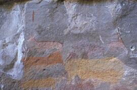There are in excess of 300 individual San rock-paintings in the site. These paintings occur in two giant panels on two tiers. The size, quantity, quality and variety of the imagery shows that the site was not only used as a practical living shelter, but also a locus of great spiritual importance to the San. The paintings are too numerous to discuss individually and I highlight certain image clusters: