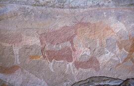 There are in excess of 300 individual San rock-paintings in the site. These paintings occur in two giant panels on two tiers. The size, quantity, quality and variety of the imagery shows that the site was not only used as a practical living shelter, but also a locus of great spiritual importance to the San. The paintings are too numerous to discuss individually and I highlight certain image clusters: