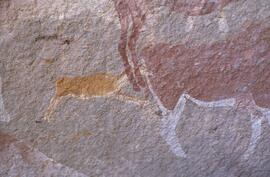 There are in excess of 300 individual San rock-paintings in the site. These paintings occur in two giant panels on two tiers. The size, quantity, quality and variety of the imagery shows that the site was not only used as a practical living shelter, but also a locus of great spiritual importance to the San. The paintings are too numerous to discuss individually and I highlight certain image clusters: