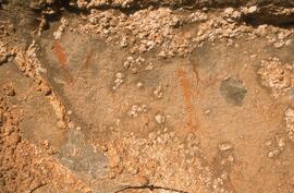 Brief description of art: On the central portion of the site's back wall, in pulses over a 11 m area, are perhaps 250 individual Bushman rock paintings. These paintings show considerable conceptual unity and centre on the Medicine Dance (also known as the 'Trance Dance'); the most pivotal and enduring of Bushman religious ceremonies. Many of the dancing figures are animal-headed and hooved - and are called 'therianthropes'. Other human figures bleed from the nose and assume a range of striking body posture such as bending forward from the waist, lying prone, holding and hand to the nose, holding arms behind the back, dancing and so forth. There are numerous eland (Tragelaophus oryx) - some of which have been re-painted (which is unusual) and, interestingly, more than a dozen hartebeest (Buselaphus) - one of which depicted in rear perspective - as well as smaller antelope such as rhebuck (Redunca fulvorufula). There is a set of distinctive white human figures. Many of the human figures are shown running - some appear to be fleeing a rough red baboon-like 'monster'. Below one very complete rendering of a Medicine Dance with dancers, shamans with constricted waists and clapping people, an animal headed snake is shown as though emerging from a crack in the rock. There are some less fine human figures depicted in a bright orange paint.