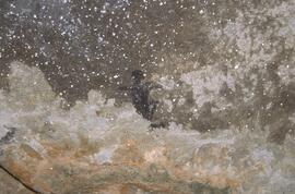 Brief description of art: There are at least 18 visible Bushman rock paintings in black, red and white paint in the site. On the ceiling above the rock block are the faded remains of at least four - and probably more - finely-painted buck in an unusual dark brown and red with forward sweeping horns. Near them is a seated black painted human figure with drawn bow and nocked arrow. There are also 3 other black painted human figures on the ceiling. The main attraction of this shelter however, is a 1,6 m x 0,3 m image cluster of 7 human figures painted in black, a thin red line that covers nearly a meter of rock, the black and red head of a fantastic monster and at least three clear and very rare paintings of dassies (rock hyrax - Procavia capensis). This cluster has a number of non-real features such as the long, spindly legs and arms of one of the human figures and the monster head. One human figure appears to be grabbing a dassie by the hind legs. The crouching human figure has two flywhisks on its waist. There is an enigmatic red circular design near one human figure's head. I black human figure has a clear face and penis and carries a stick. Two dassies have a short black line from the top of their snouts.