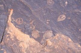 Khoe herder rock engravings: There are fewer of these engravings- perhaps 50-75. Most of the Khoe herder rock engravings are located higher up on the larger peak, nearer the caves. These engravings have few representational forms and are dominated by geometric forms such as circles (with or without internal divisions), sunburst-like motifs, grids and so forth. There are also some Khoe engravings mixed in with the Bushman engravings and these take the forms of a few bags, at least one apron and a number of 'spread-eagle' animal skins.