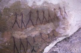 It was late in life when Joan Simpson read Alex Wilcox' book Rock Paintings of the Drakensburg, and was inspired to take up rock art photography as a hobby. She enjoyed walking, hiking and hunting for possible rock art sites. Her journals note how she became so invested in recording rock art, she speaks of deriving "enormous pleasure from searching for paintings and recording them, and identifying the kind of animals depicted, the weapons and dress of the people". However the aspect of rock art that Simpson found most compelling was its artistic merit. In a journal entry she states: "…for me, overshadowing everything else, is the enormous pleasure in the artistic merits of the paintings themselves… colour … shading … perspective … the skill needed to draw a beautiful eland… when the only implements an artist had were fashioned by himself… the sense of movement, … of pattern, The grouping, the story, sometimes the humour which a panel may tell. All these things enthralled me." Simpson was enthusiastic in her work, making accurate notes on the slides themselves, measuring individual figures, noting site names and dates when taken. Her dedication to her hobby is evident in her investment in photographic equipment, which included: a camera, tripod, light meter, flash, rings, extra film, a notebook and a foot-rule. She would give illustrated lectures and was attempting to write a book on the subject. Living in Harrismith, Free State, Simpson had access to much of the rock art in that province, as a result, her most sizeable collection of slides is representative of many sites in the Free State. Simpson later moved to Natal and recorded a significant number of sites in this area. Her Collection also includes some images from Zimbabwe and Spain. In 1981, after her death, Simpson's slides, notes and books were given to the Natal Museum Archaeology department as per her will. A decade later the Natal Museum took the decision to give Simpson's Free State slides to the National Museum in Bloemfontein to be included in their archive. Simpson began photographing rock art in the early 1960's and continued to do so into her old age in the 1970's. Her slides therefore hold great value as archival resources and as indicators of weathering and deterioration of the rock art recorded