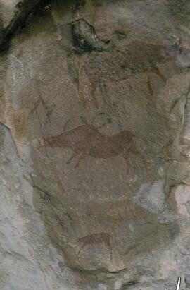 It was late in life when Joan Simpson read Alex Wilcox' book Rock Paintings of the Drakensburg, and was inspired to take up rock art photography as a hobby. She enjoyed walking, hiking and hunting for possible rock art sites. Her journals note how she became so invested in recording rock art, she speaks of deriving "enormous pleasure from searching for paintings and recording them, and identifying the kind of animals depicted, the weapons and dress of the people". However the aspect of rock art that Simpson found most compelling was its artistic merit. In a journal entry she states: "…for me, overshadowing everything else, is the enormous pleasure in the artistic merits of the paintings themselves… colour … shading … perspective … the skill needed to draw a beautiful eland… when the only implements an artist had were fashioned by himself… the sense of movement, … of pattern, The grouping, the story, sometimes the humour which a panel may tell. All these things enthralled me." Simpson was enthusiastic in her work, making accurate notes on the slides themselves, measuring individual figures, noting site names and dates when taken. Her dedication to her hobby is evident in her investment in photographic equipment, which included: a camera, tripod, light meter, flash, rings, extra film, a notebook and a foot-rule. She would give illustrated lectures and was attempting to write a book on the subject. Living in Harrismith, Free State, Simpson had access to much of the rock art in that province, as a result, her most sizeable collection of slides is representative of many sites in the Free State. Simpson later moved to Natal and recorded a significant number of sites in this area. Her Collection also includes some images from Zimbabwe and Spain. In 1981, after her death, Simpson's slides, notes and books were given to the Natal Museum Archaeology department as per her will. A decade later the Natal Museum took the decision to give Simpson's Free State slides to the National Museum in Bloemfontein to be included in their archive. Simpson began photographing rock art in the early 1960's and continued to do so into her old age in the 1970's. Her slides therefore hold great value as archival resources and as indicators of weathering and deterioration of the rock art recorded