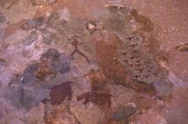 It was late in life when Joan Simpson read Alex Wilcox' book Rock Paintings of the Drakensburg, and was inspired to take up rock art photography as a hobby. She enjoyed walking, hiking and hunting for possible rock art sites. Her journals note how she became so invested in recording rock art, she speaks of deriving "enormous pleasure from searching for paintings and recording them, and identifying the kind of animals depicted, the weapons and dress of the people". However the aspect of rock art that Simpson found most compelling was its artistic merit. In a journal entry she states: "…for me, overshadowing everything else, is the enormous pleasure in the artistic merits of the paintings themselves… colour … shading … perspective … the skill needed to draw a beautiful eland… when the only implements an artist had were fashioned by himself… the sense of movement, … of pattern, The grouping, the story, sometimes the humour which a panel may tell. All these things enthralled me." Simpson was enthusiastic in her work, making accurate notes on the slides themselves, measuring individual figures, noting site names and dates when taken. Her dedication to her hobby is evident in her investment in photographic equipment, which included: a camera, tripod, light meter, flash, rings, extra film, a notebook and a foot-rule. She would give illustrated lectures and was attempting to write a book on the subject. Living in Harrismith, Free State, Simpson had access to much of the rock art in that province, as a result, her most sizeable collection of slides is representative of many sites in the Free State. Simpson later moved to Natal and recorded a significant number of sites in this area. Her Collection also includes some images from Zimbabwe and Spain. In 1981, after her death, Simpson's slides, notes and books were given to the Natal Museum Archaeology department as per her will. A decade later the Natal Museum took the decision to give Simpson's Free State slides to the National Museum in Bloemfontein to be included in their archive. Simpson began photographing rock art in the early 1960's and continued to do so into her old age in the 1970's. Her slides therefore hold great value as archival resources and as indicators of weathering and deterioration of the rock art recorded
