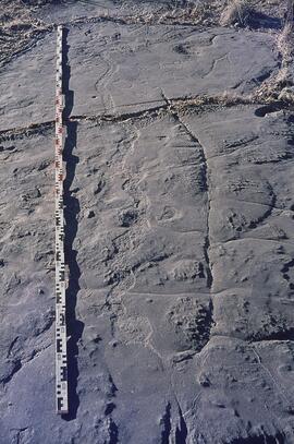 Brief description of art: On the central portion of the site's back wall, in pulses over a 11 m area, are perhaps 250 individual Bushman rock paintings. These paintings show considerable conceptual unity and centre on the Medicine Dance (also known as the 'Trance Dance'); the most pivotal and enduring of Bushman religious ceremonies. Many of the dancing figures are animal-headed and hooved - and are called 'therianthropes'. Other human figures bleed from the nose and assume a range of striking body posture such as bending forward from the waist, lying prone, holding and hand to the nose, holding arms behind the back, dancing and so forth. There are numerous eland (Tragelaophus oryx) - some of which have been re-painted (which is unusual) and, interestingly, more than a dozen hartebeest (Buselaphus) - one of which depicted in rear perspective - as well as smaller antelope such as rhebuck (Redunca fulvorufula). There is a set of distinctive white human figures. Many of the human figures are shown running - some appear to be fleeing a rough red baboon-like 'monster'. Below one very complete rendering of a Medicine Dance with dancers, shamans with constricted waists and clapping people, an animal headed snake is shown as though emerging from a crack in the rock. There are some less fine human figures depicted in a bright orange paint.