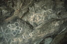Brief description of art: All much blackened by fire lit near base of boulder. Motifs include various spread-eagled designs, all in white, some daubed, some applied by finger. Most of those applied by finger are smaller and are arranged around the others suggesting a later date. Also white daubed snake-like meander decorated with black dots. 2 unusual motifs composed of many squashed circles attached together to form a single design, applied by finger in white (compare with Sanchira 1). A few rows of red dots, applied by finger, can be seen, partially overlain by the white designs.