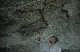 Brief description of art: The art consists of many varied spread-eagled designs all daubed in white, the one on the ceiling is remarkable in size and has been repainted at least twice. Some of the images are heavily blackened by soot. At the left end of the shelter and there are a few red designs applied by finger including dots, short vertical lines, a concentric circle and a half circle open at top with single internal vertical division.