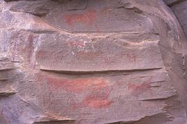 Lower in the panel are four figures in dynamic running postures with their legs fully outstretched. More interestingly, their limbs are ornately embellished with white zigzag patterns- in one case, it is only a single line, but other two figures have double lines. To the right of the panel are two human figures with bellies outlined in white pigment. Nearby is another figure with pronounced 'arms-back' posture. Below the ledge on this section of the panel is a crude painting of a human figure in white pigment that seems to have been made by using the finger. As we show later this manner of painting is associated with a different art tradition. Zigzags