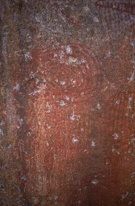 Brief description of site: Finger Dots. The panel is on a flat rock surface under a slight overhang. The panel is still fairly protected and apart from human damage, the images appear to be well preserved. The middle of the large animal, formerly interpreted as intestines. Has been partially outlined in green crayon. Partly pecked from human activity. This does not seem to have seriously damaged the art.