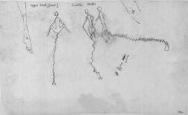 Upper tier: Dominating this upper tier is a painted herd of over 40 eland (Tragelaphus oryx) painted in very nearly every conceivable pose and perspective. These eland are painted in red, white and red or orange ochre. Some of the eland are shaded, some are bichrome and some are polychrome (many colours). These eland are shown from above, below, upside-down, on their side, lying down, standing, resting, galloping and so fort. Interestingly, behind the lying down eland is a figure that most people have identified as an ostrich (see cover of 'major Rock Paintings of Southern Africa', attached). This is, however, incorrect as Mr Sephton of Pitlochrie correctly points out, it is an eland the artist got in a tangle over. Notice the black pads on the legs. At the far left of this giant panel are two exceptional therianthropes. These therianthropes - part-human and part-animal beings - are exceptionally large at 880 mm tall. Look closely at their feet and you will see they have hooves and even leave a trail of eland spoor. This entire panel is visually dominant and strikes one immediately upon entering the cave. The focus on eland, human figures and therianthropes gives this panel a tight conceptual unity. Given the visual appearance of the pigment and imagery, it would appear that this panel was painted by one or a small group of individuals in no more than three painting episodes. This is thus comparable to a work like Michaelangelo's Sistine Chapel work.