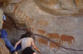Elephants are fairly frequently painted and engraved in certain regions.The paintings may be in red, black or white. Sometimes elephants are shown being hunted by a large party of men.